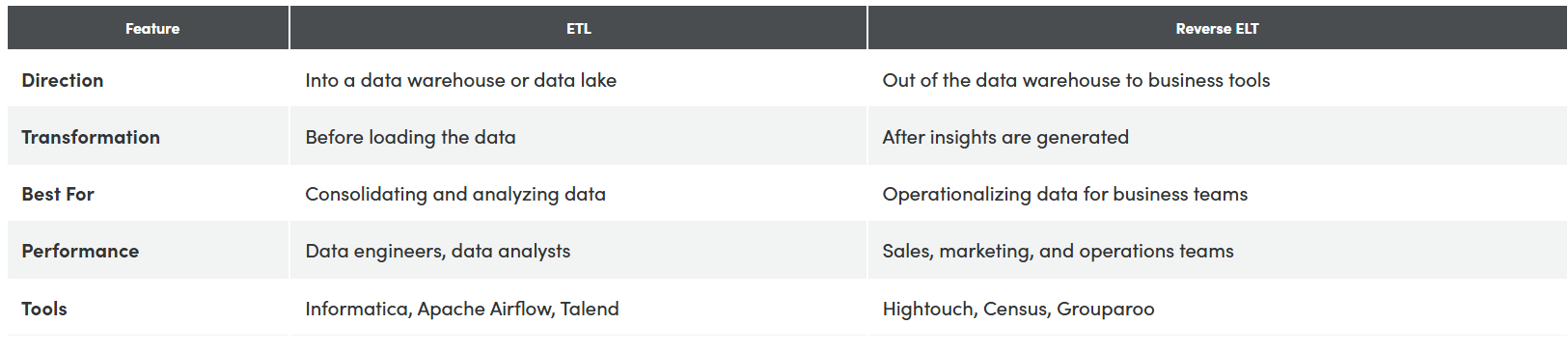 • Reverse ETL: Moves processed insights from the data warehouse back into operational systems, enabling business teams to act on the data.