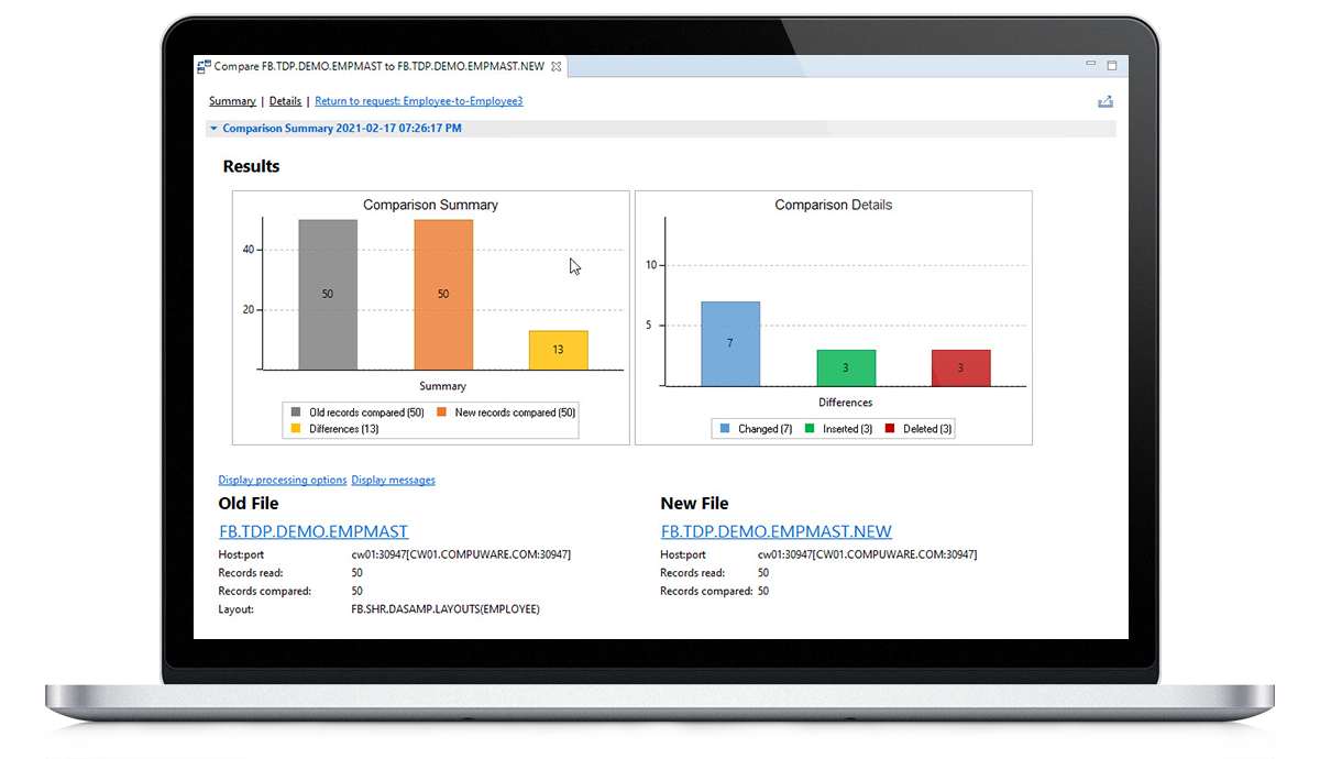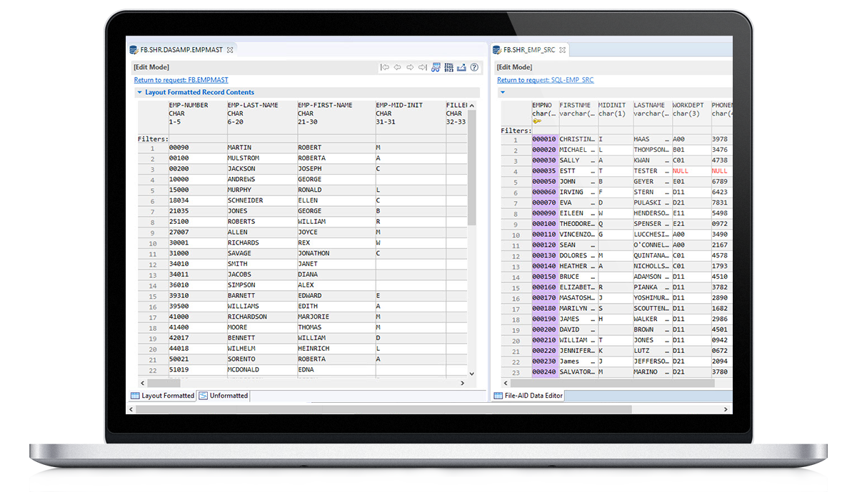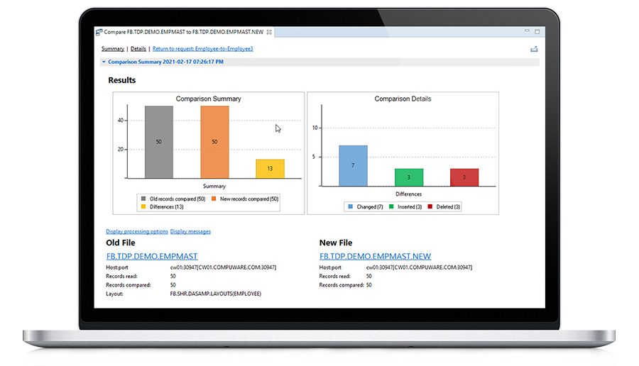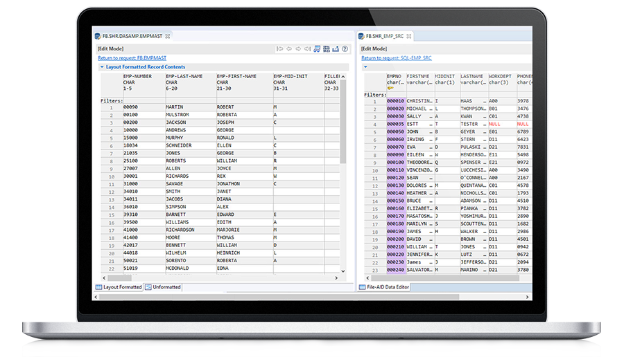 The unified interface also makes it simple to compare and edit data in multiple files (IBM® Db2®, IBM® IMSTM, SQL Server, Oracle, and VSAM) all in one place, and to accurately identify the impact of changing data.