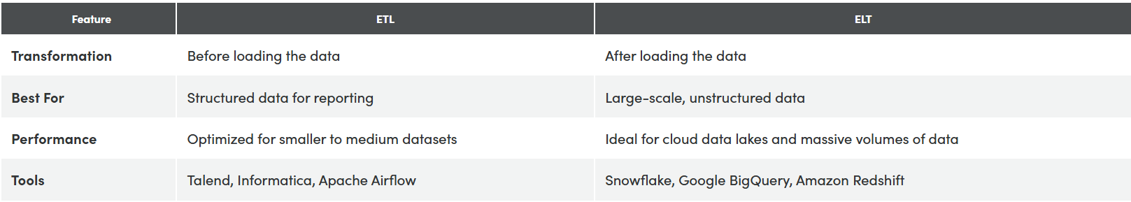 • ETL: Data is transformed before being loaded into the target system. Best for structured data and traditional reporting.